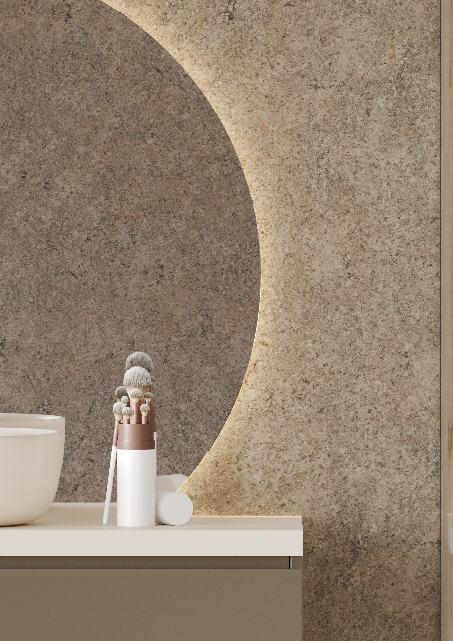 Även designnyheterna har fått stor uppmärksamhet. Fibo presenterar fem nya steninspirerade dekorer – Salted Stone, Pebble Granite, Rustic Granite, Arctic Onyx och Cloudy Onyx.