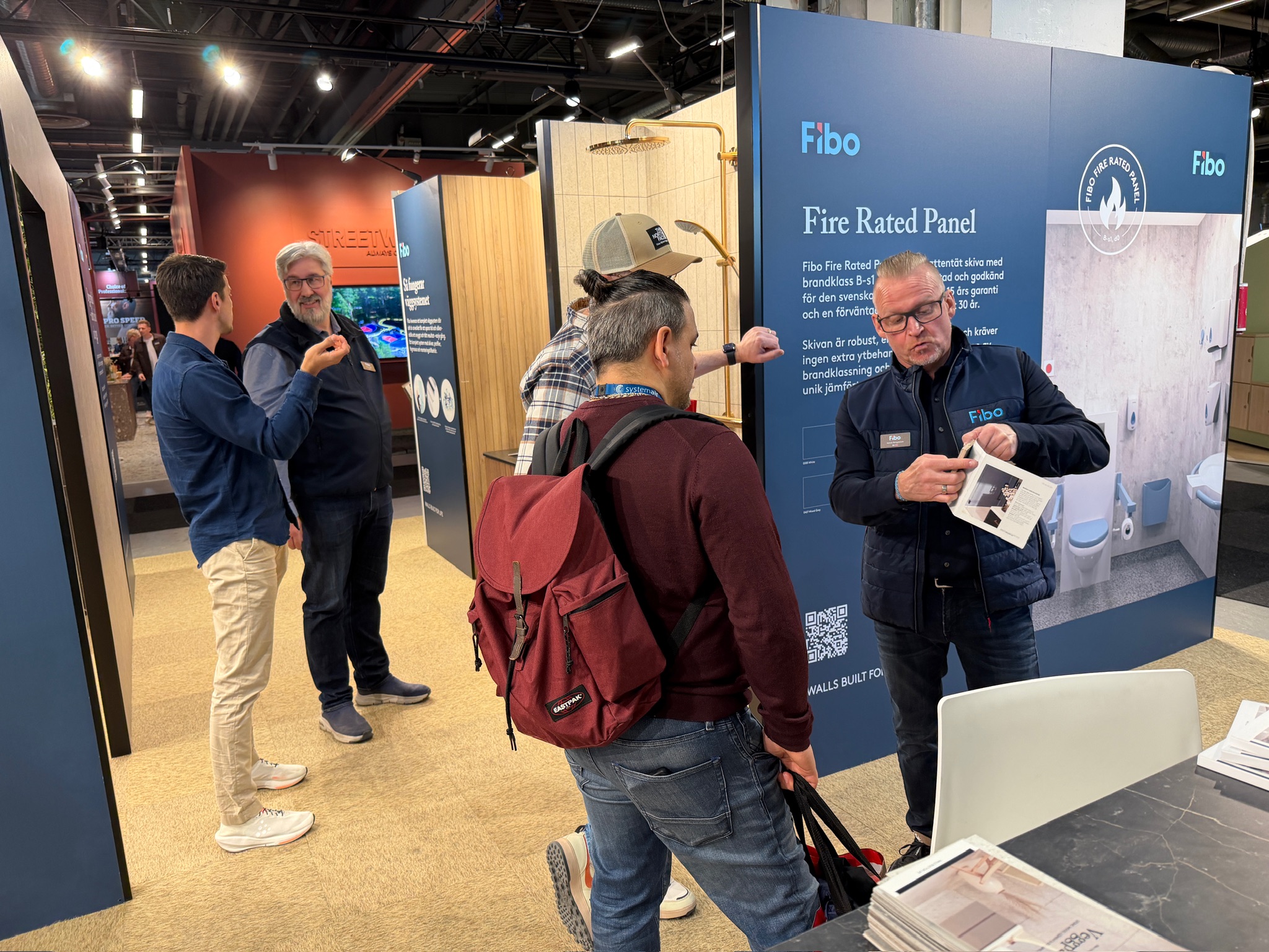 Flera besökare har också visat stort intresse för Fibos väggskivor som ett alternativ till kakel och plastmatta. Systemet är testat och godkänt för användning i våtrum enligt Boverkets byggregler (BBR) och ger ett komplett, 100 % vattentätt resultat utan behov av bakomliggande tätskikt. Det bidrar till färre arbetsmoment och minskad risk i projekten.