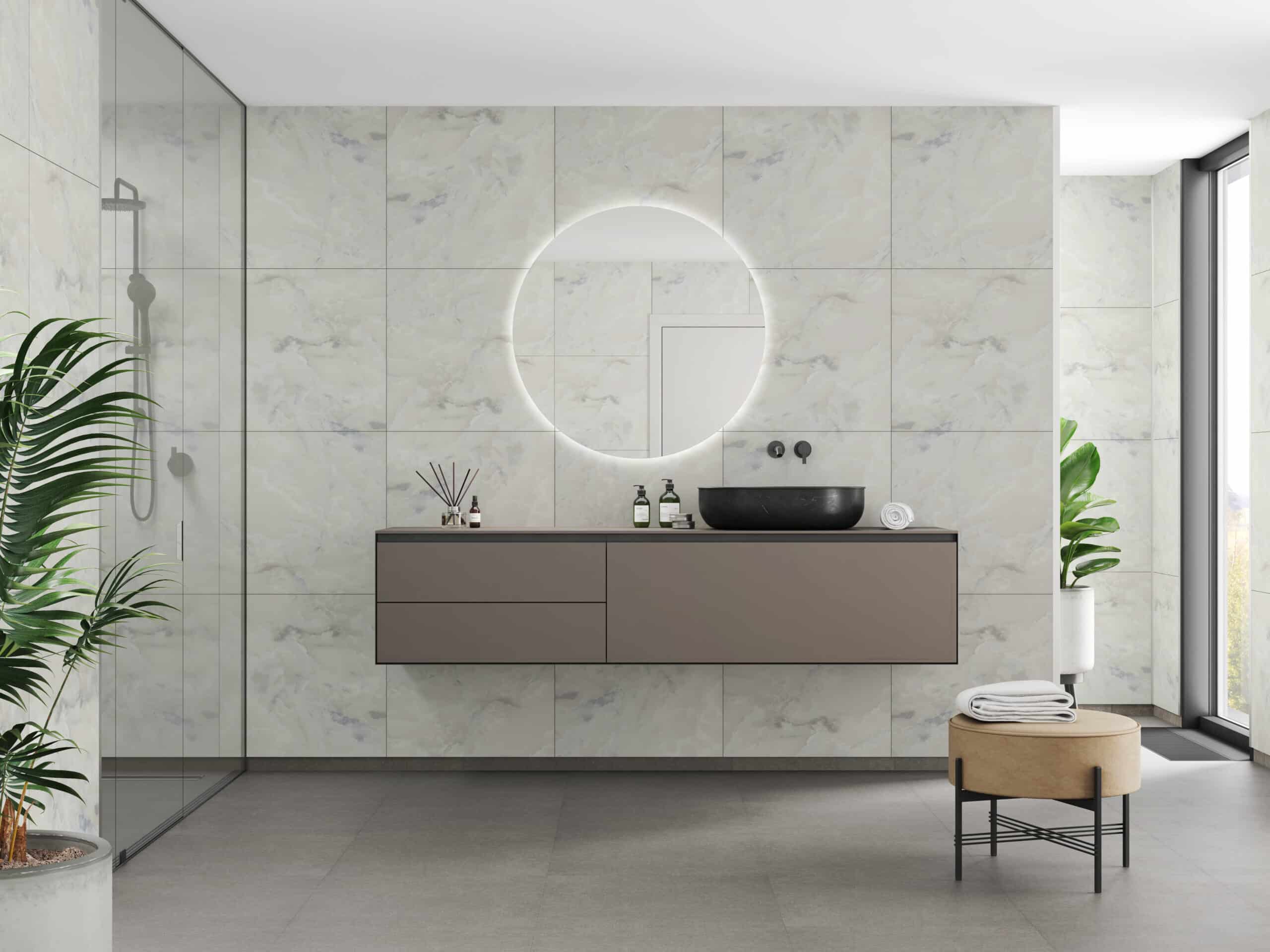 Dekoren ger rummet ett exklusivt och rofyllt uttryck där ljuset spelar i stenstrukturen och skapar djup och karaktär. Arctic Onyx passar perfekt i moderna badrum där man vill skapa en ljus, lyxig och spa-inspirerad atmosfär.